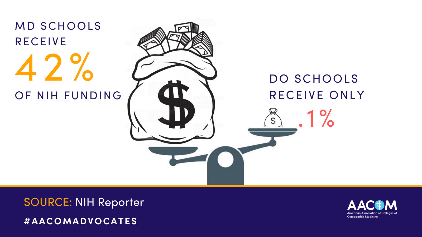 Increased funding and enhanced osteopathic research opportunities for Colleges of Osteopathic Medicine (COMs) across all Institutes and Centers at the National Institutes of Health (NIH) will strengthen research in the areas of primary care, community-based training and service, and it will address health disparities of rural and underserved populations.