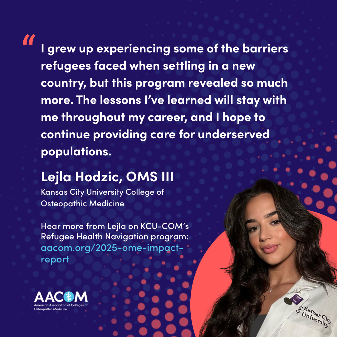 "Throughout my life I was always a [health] advocate for my family. I grew up experiencing some of the barriers refugees faced when settling in a new country, but this program revealed so much more. The lessons I’ve learned will stay with me throughout my career, and I hope to continue providing care for underserved populations,” shared Lejla Hodzic, OMS III at KCU-COM. Check out her perspective helping form the KCU Refugee Health Navigation Pilot.