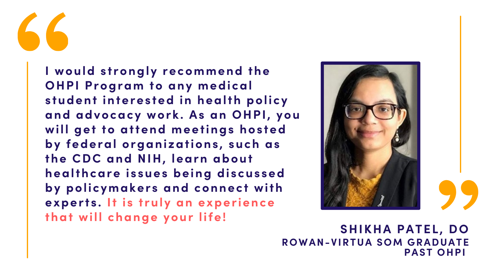 The Osteopathic Health Policy Internship (OHPI) Program enables osteopathic medical students to spend eight consecutive weeks working virtually with AACOM's Government Relations (GR) department. To the practical extent, every effort is made to identify the eight-week period that best accommodates each student's schedule. The OHPI Program affords osteopathic medical students the opportunity to learn about and advance AACOM GR’s legislative and regulatory advocacy priorities, including the FAIR Act (H.R. 2314 / S. 2715,) the Community TEAMS Act (H.R. 3885), rural healthcare, and osteopathic research funding. Past interns have gone on to become healthcare policy leaders, such as Policy Committee Chair of the AOGME Residents and Fellows Council and Vice-Chair of Health Policy at the Emergency Medicine Residents Association.